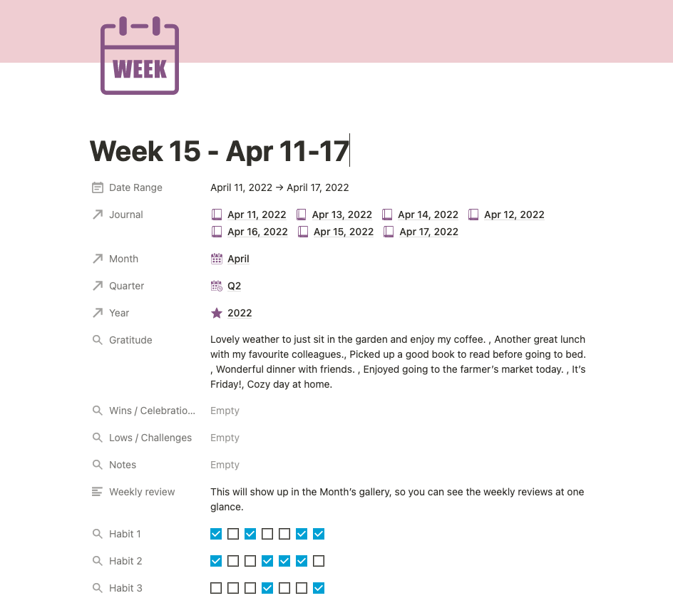 - review your week, month, quarter and year at a glance.